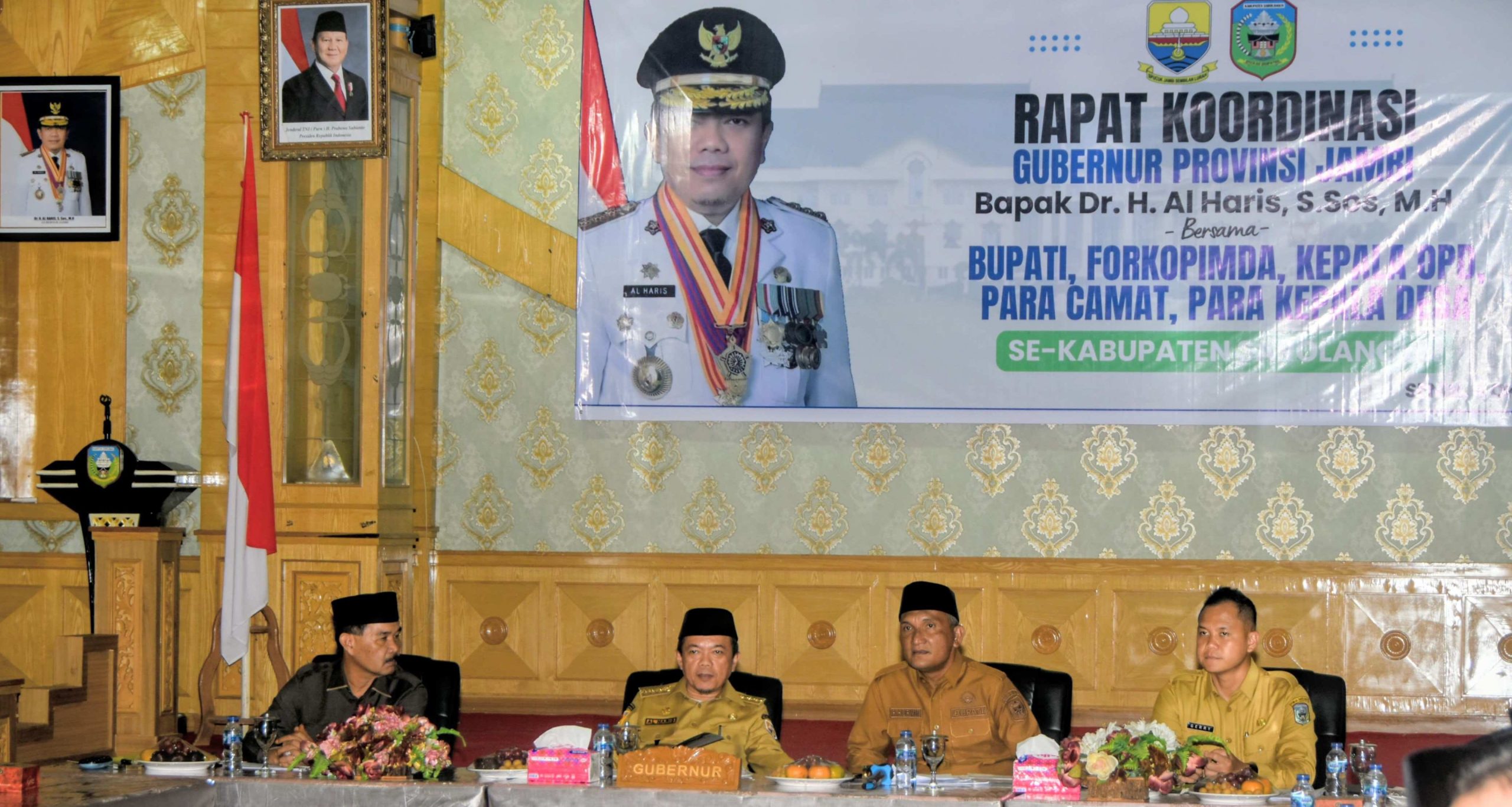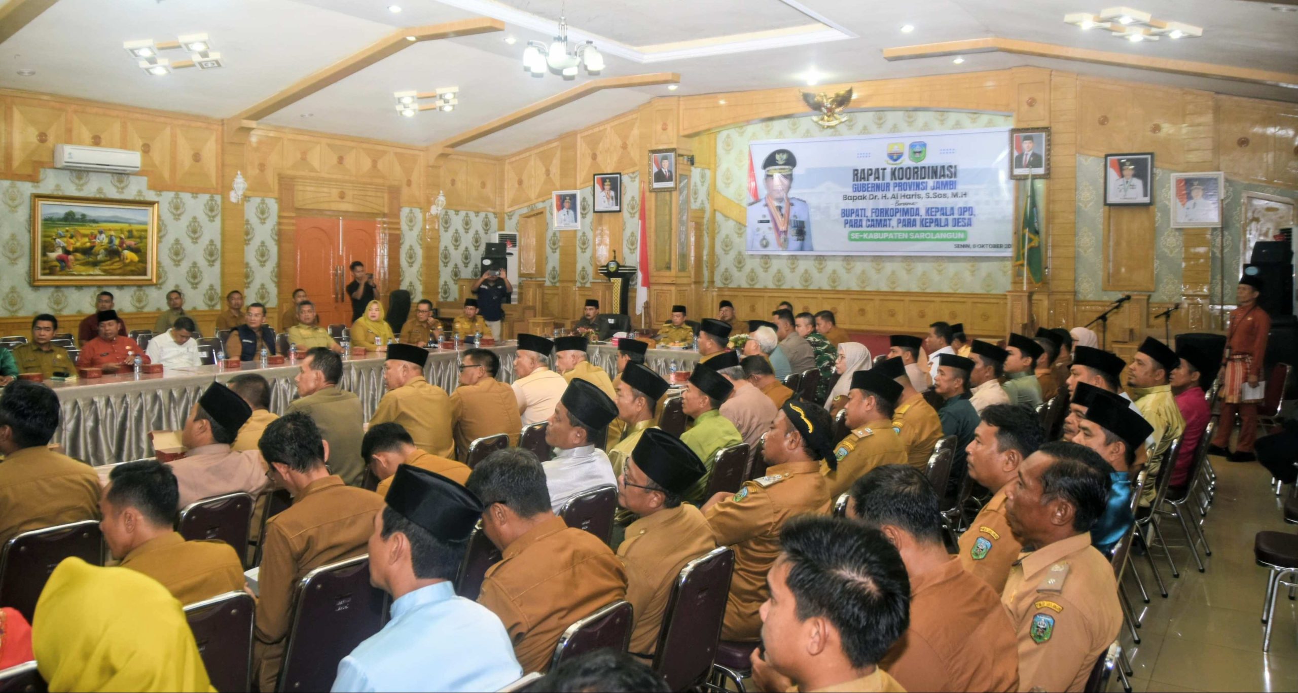 SAROLANGUN UPDATE – Pemerintah Kabupaten Sarolangun bersama Forkopimda, Para Camat dan Para Kepala Desa melaksanakan kegiatan Rapat Koordinasi Dengan Gubernur Jambi Dr H Al Haris, S.Sos, MH, dalam rangka membahas progres pelaksanaan program prioritas nasional dalam mendukung astacita Bapak Presiden dan Wakil Presiden Republik Indonesia Senin (06/10/2025) di Ruang Pola Kantor Bupati Sarolangun.